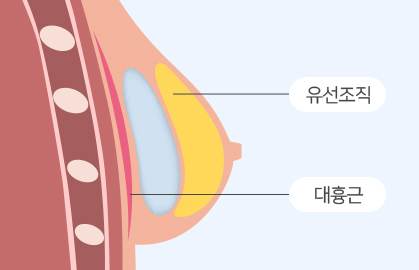 보형물의 상부는 가슴근육(대흉근) 밑에,